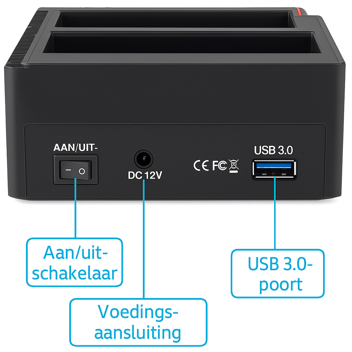 - LED-indicatoren: Power, HDD ACT, Card ACT + Clone progress (25%, 50%, 75%, 100%)