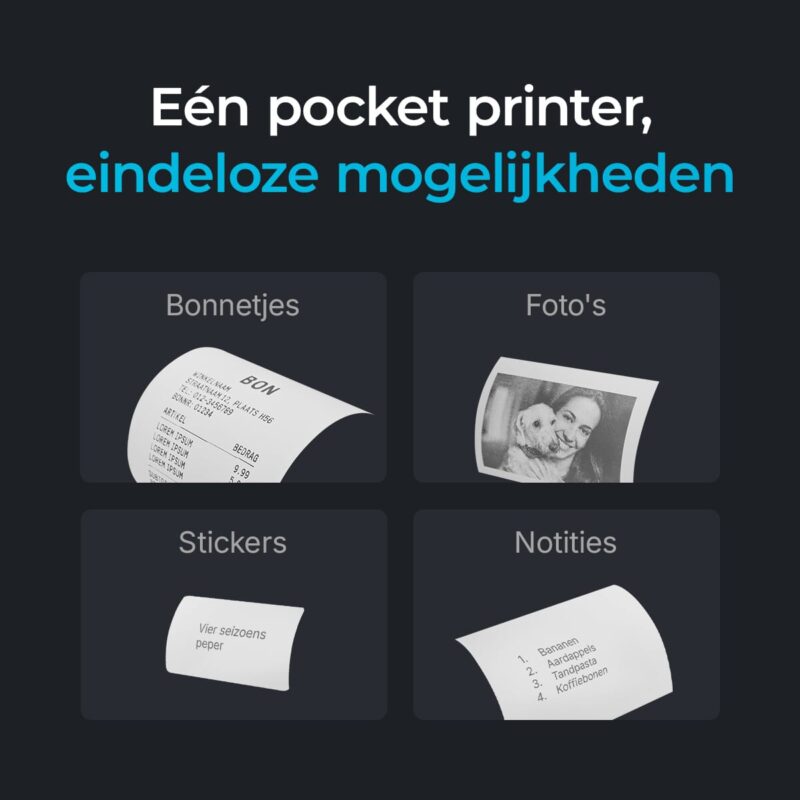 - Veelzijdig gebruik: ideaal als sticker printer, label printer, fotoprinter voor smartphone en etiketten printer.
