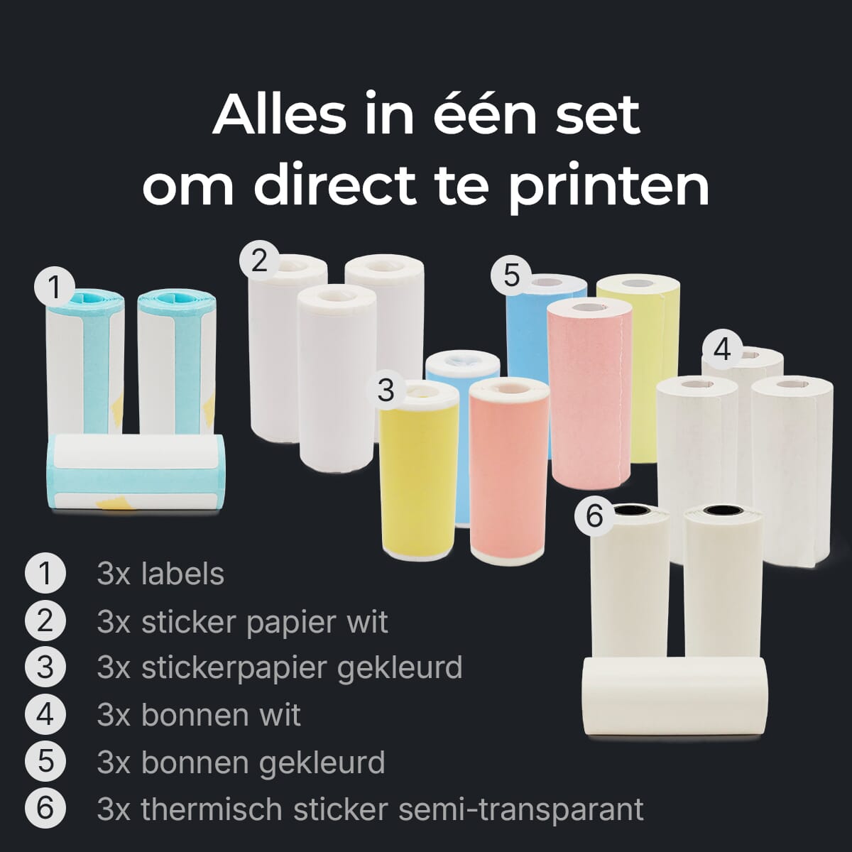 | Verpakkingsinhoud | Printer + 3x labels, 3x. sticker papier wit, 3x stickerpapier gekleurd, 3x bonnen wit, 3x bonnen gekleurd, 3x thermisch sticker semi-transparant |