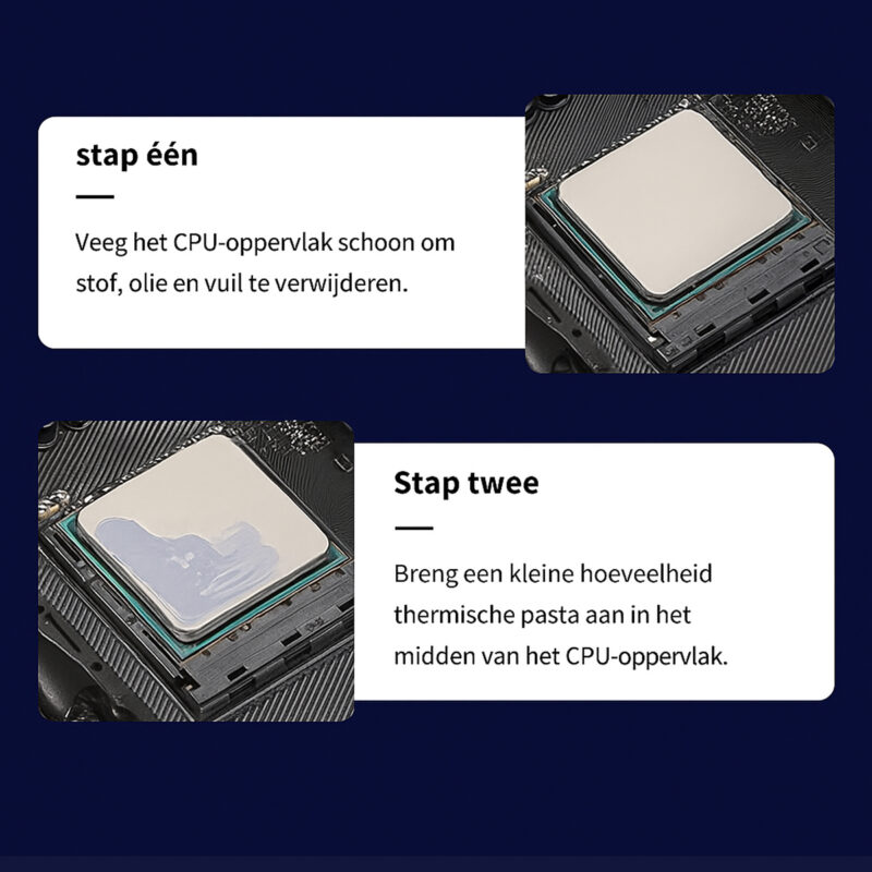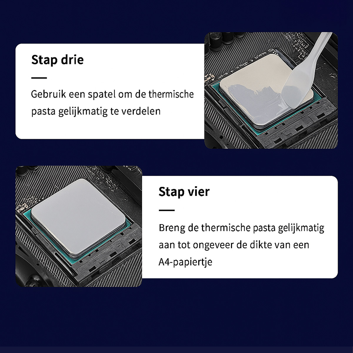 De koelpasta is elektrisch niet-geleidend, waardoor er geen risico is op kortsluiting. De hittebestendige formule blijft stabiel tot temperaturen van 280°C.