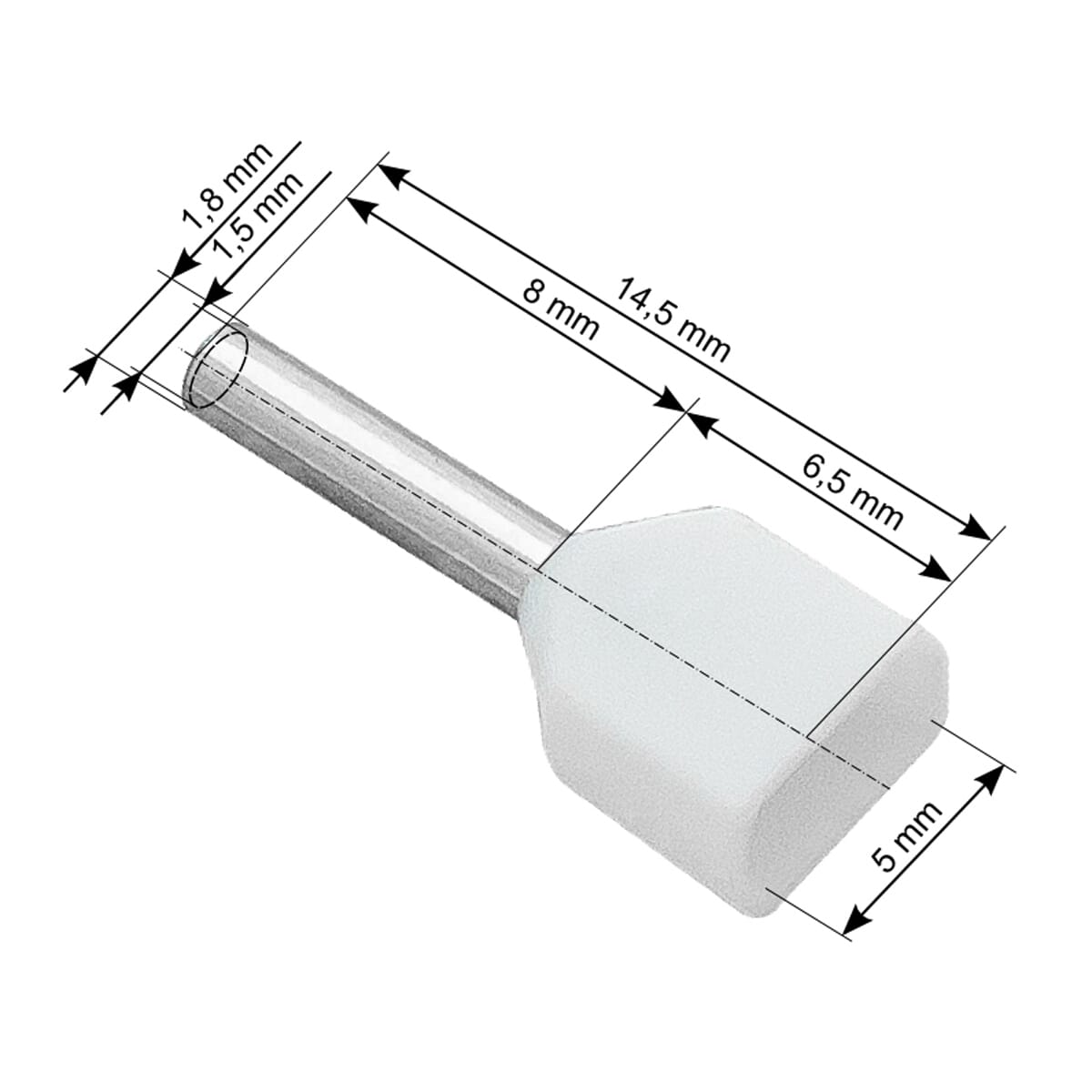 De VLTG Geïsoleerde Aderhuls 2×0.5/8mm in witte uitvoering is een essentieel product voor het veilig en efficiënt verbinden van elektrische draden. Deze eindhuls is ontworpen om de uiteinden van kabels te beschermen en te isoleren, waardoor de kans op kortsluiting of beschadiging wordt verminderd. Het product is geschikt voor gebruik in diverse elektrische installaties en projecten.