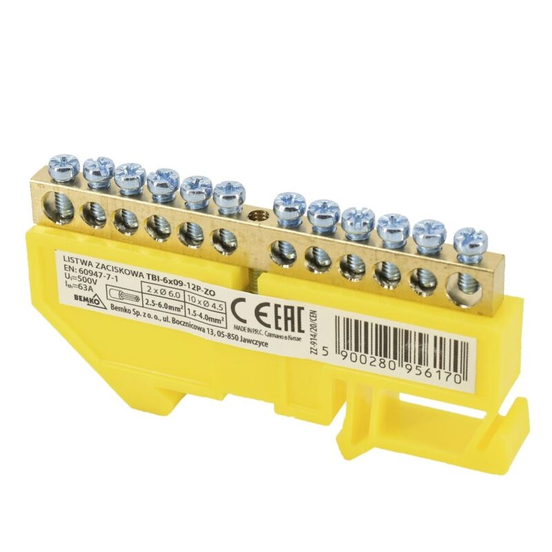 DIN-rail Klemblok 12-polig – 63A – 500V – Gele Verdeelstrip