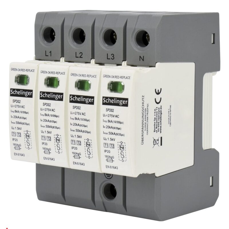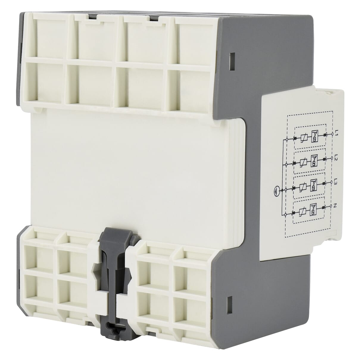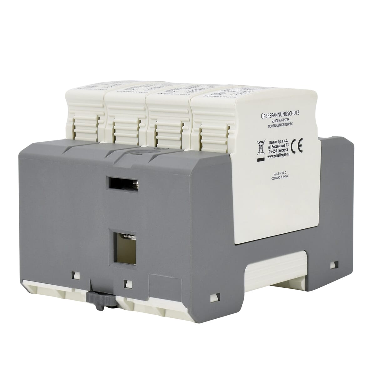 Deze 4-polige overspanningsbeveiliging van Schelinger is ontworpen om elektrische installaties te beschermen tegen blikseminslag, netstoringen en andere overspanningspieken.