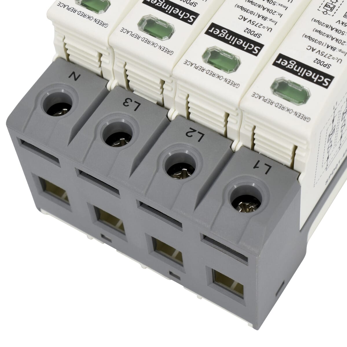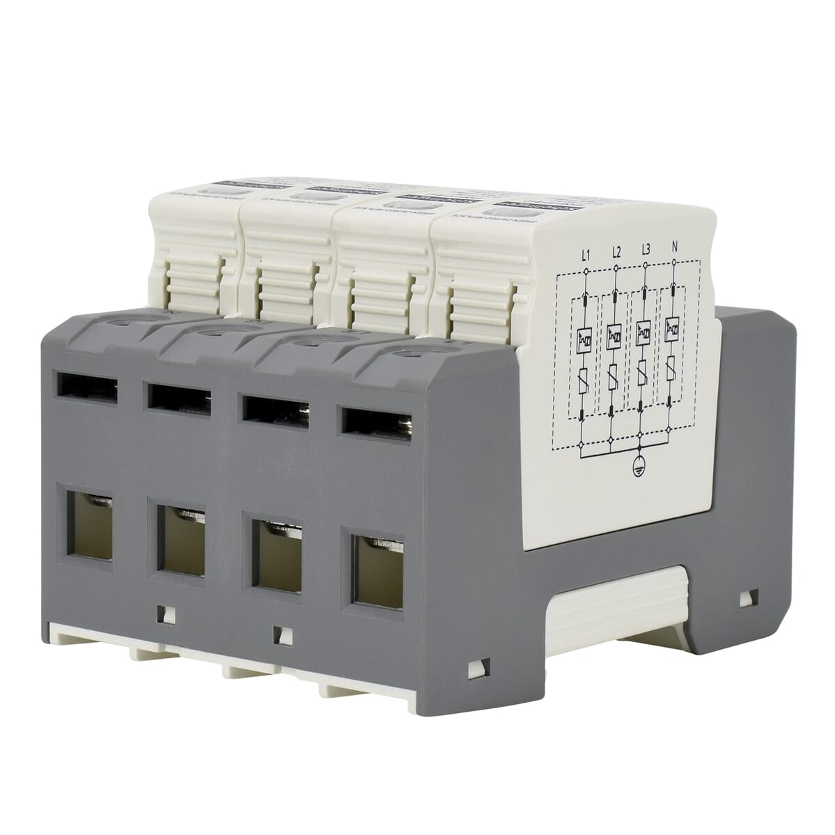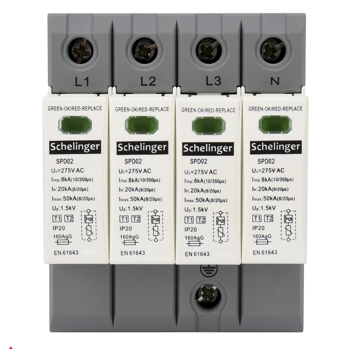 Deze 4-polige overspanningsbeveiliging van Schelinger is ontworpen om elektrische installaties te beschermen tegen blikseminslag, netstoringen en andere overspanningspieken.