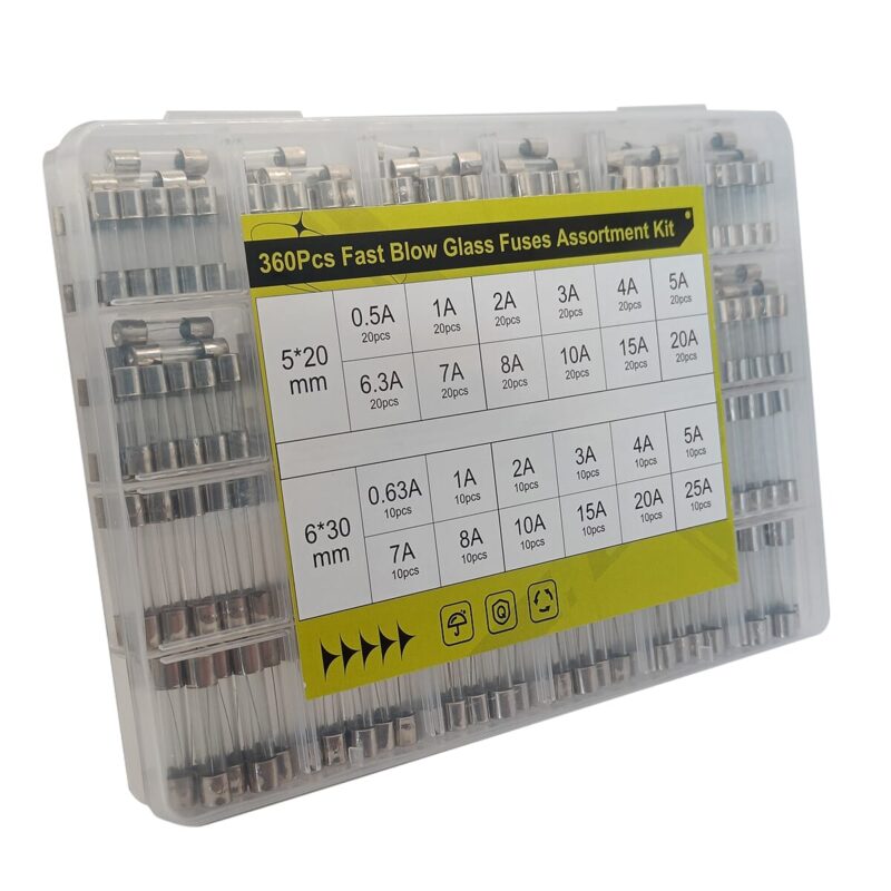 Glaszekeringen set 360 stuks F(snel) – 180x 5x20mm 0.5/20A – 180x 6x30mm 0.63A/25A – Beschermt tegen kortsluiting