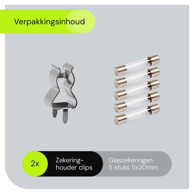Bescherm je elektrische apparaten met de betrouwbare en eenvoudig te installeren VLTG Zekeringhouder clips 5x20mm – 12A – Klein – F(snel) – inclusief 5x Glaszekeringen!