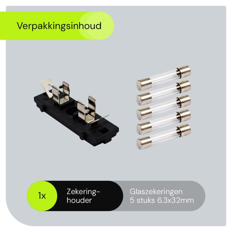 - Kan ik andere zekeringen gebruiken in deze houder? Ja, zolang ze dezelfde afmetingen (6.3x32mm) en een geschikte nominale stroom hebben.