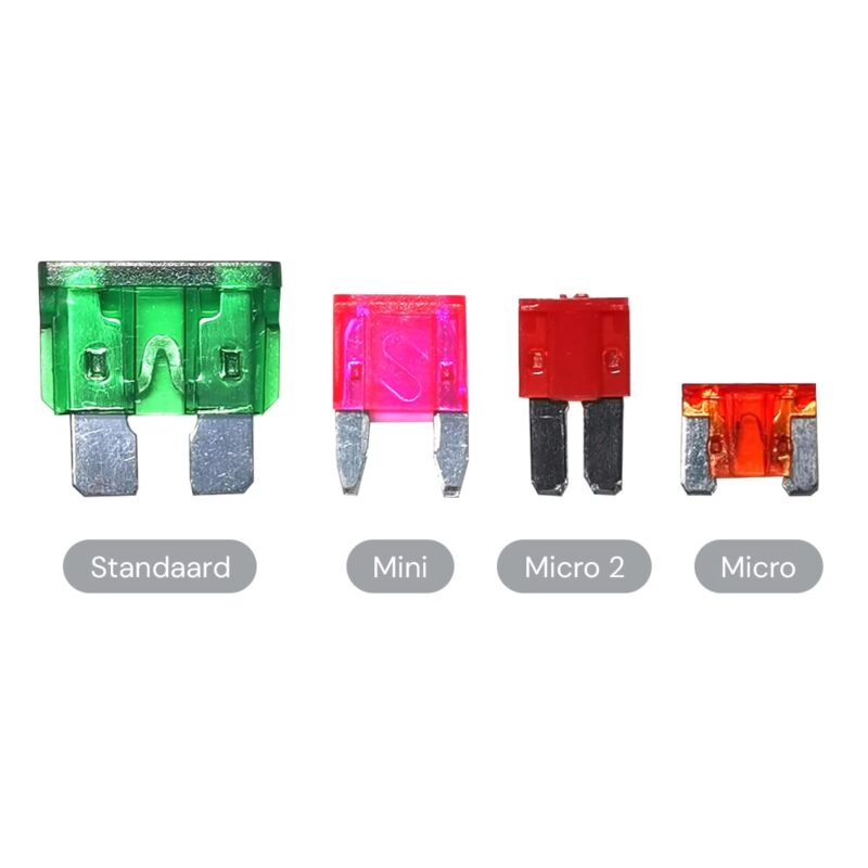 - Zie de afbeelding voor de verschillende type steekzekeringen: Standaard, Mini, Micro 2 en Micro
