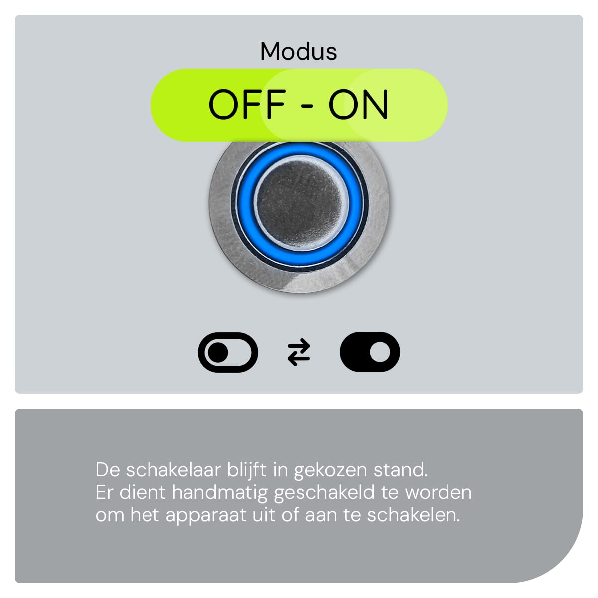 De ProRide Metalen Drukschakelaar werkt eenvoudig: sluit de schakelaar aan op een 12V of 24V stroombron met de meegeleverde aansluitkabel. Druk op de knop om de stroom in of uit te schakelen. De blauwe LED indicatie geeft duidelijk aan of de schakelaar aan of uit staat.