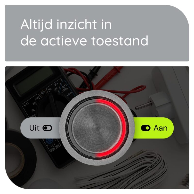 De ProRide Metalen Drukschakelaar werkt eenvoudig met een druk op de knop. De schakelaar heeft een ON-OFF functie, wat betekent dat je hem kunt gebruiken om een circuit aan of uit te zetten. De rode LED-indicatie licht op wanneer de schakelaar in de ‘aan’ positie staat, zodat je altijd weet of het circuit actief is.