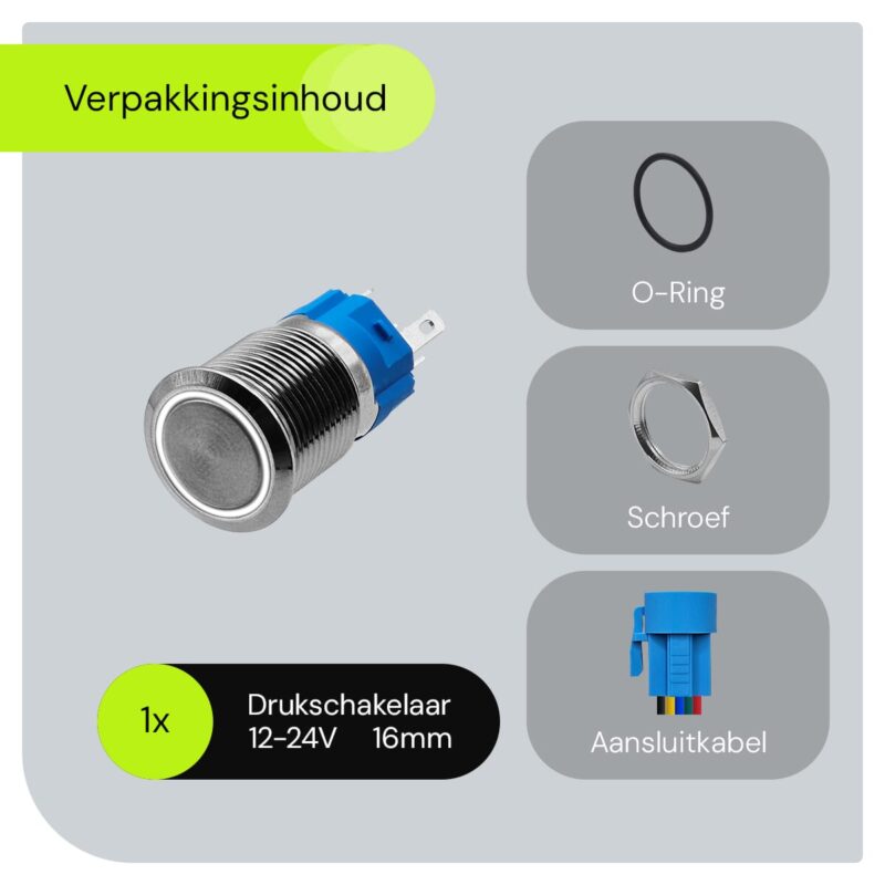 - Hoe groot is de schakelaar? De schakelaar heeft een diameter van 16mm, wat hem compact en veelzijdig maakt voor verschillende toepassingen.