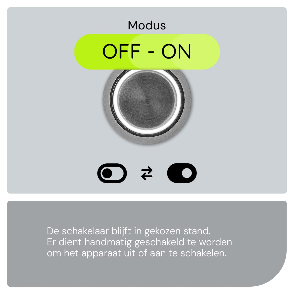 De ProRide Metalen Drukschakelaar werkt op een eenvoudige ON-OFF basis. Wanneer je op de knop drukt, schakelt de stroom aan of uit, afhankelijk van de huidige status. De witte LED-indicatie licht op wanneer de schakelaar in de ‘aan’ positie staat, zodat je altijd weet wanneer het apparaat actief is.