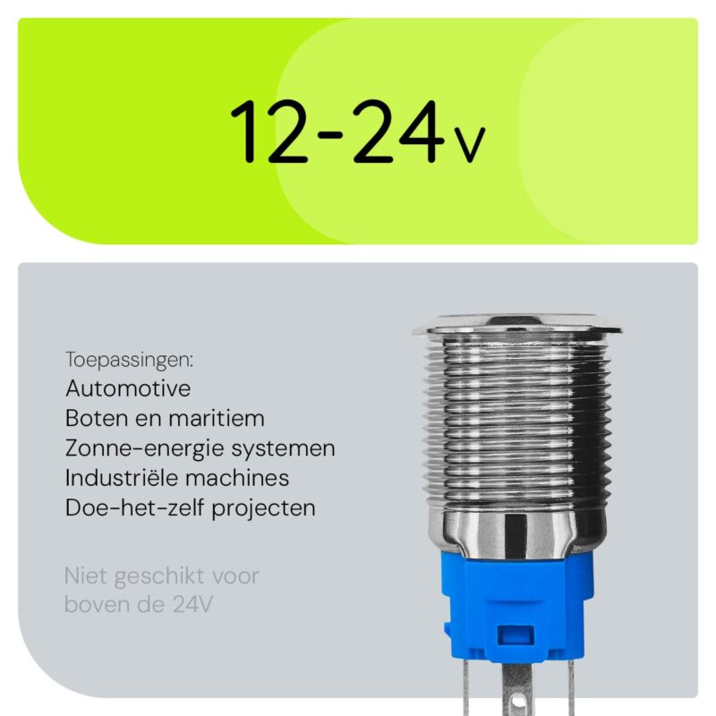 - Is de schakelaar geschikt voor zowel 12V als 24V systemen? Ja, de ProRide Metalen Drukschakelaar is compatibel met zowel 12V als 24V systemen.