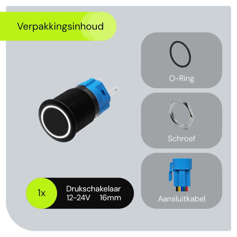 - Hoe groot is de schakelaar? De schakelaar heeft een diameter van 16mm, wat hem compact en veelzijdig maakt voor verschillende toepassingen.