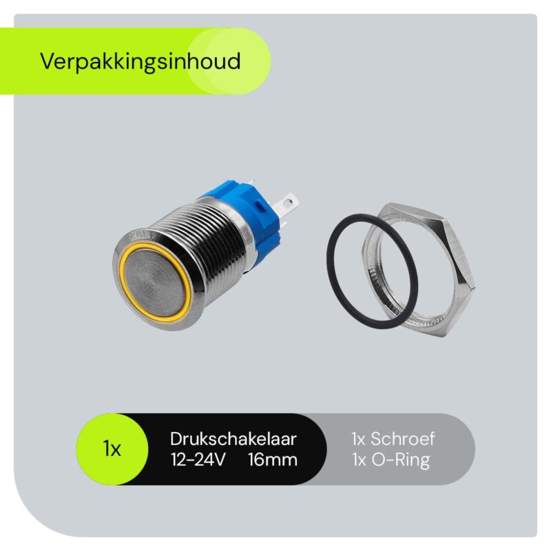 ProRide Metalen Drukschakelaar 12V ON-OFF – 16mm – Aan/uit schakelaar – Spatwaterdicht – 12V/24V – LED Indicatie Geel