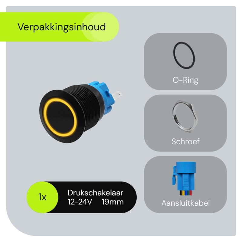 ProRide Metalen Drukschakelaar 12V ON-OFF – 19mm – Aan/uit schakelaar met Aansluitkabel – Spatwaterdicht – 12V/24V – LED Indicatie Geel