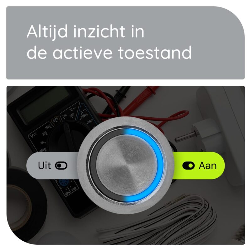 De ProRide Metalen Drukschakelaar werkt eenvoudig met een druk op de knop. De schakelaar heeft een ON-OFF functie, wat betekent dat je hem kunt gebruiken om een circuit aan of uit te zetten. De blauwe LED-indicatie licht op wanneer de schakelaar in de ‘aan’ positie staat, zodat je altijd weet of het circuit actief is.