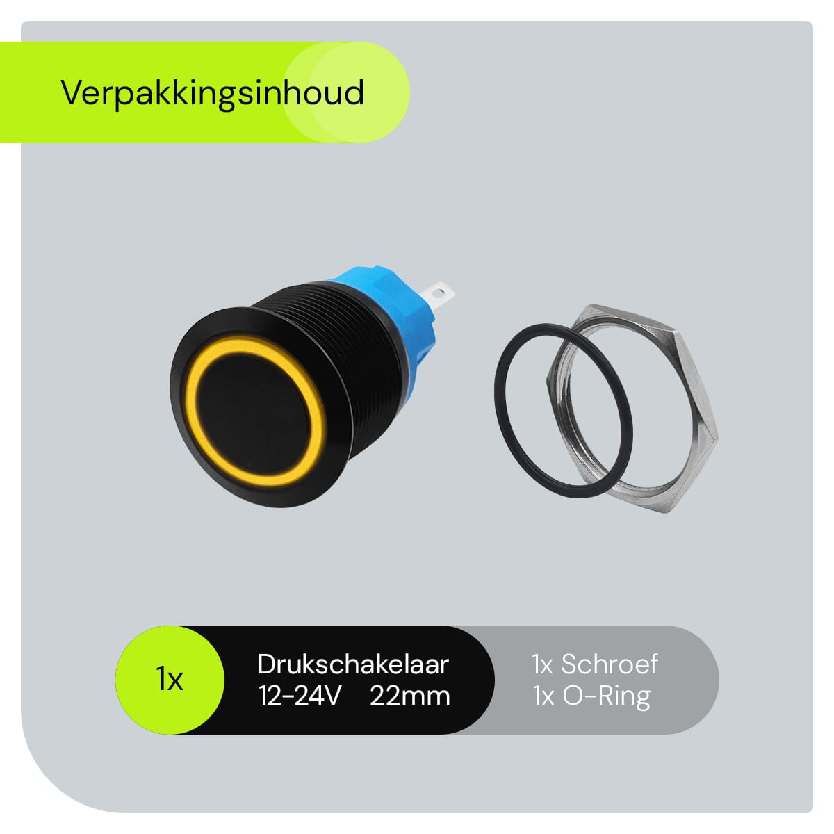 - Hoe groot is de schakelaar? De schakelaar heeft een diameter van 22mm, wat hem compact en gemakkelijk te installeren maakt.