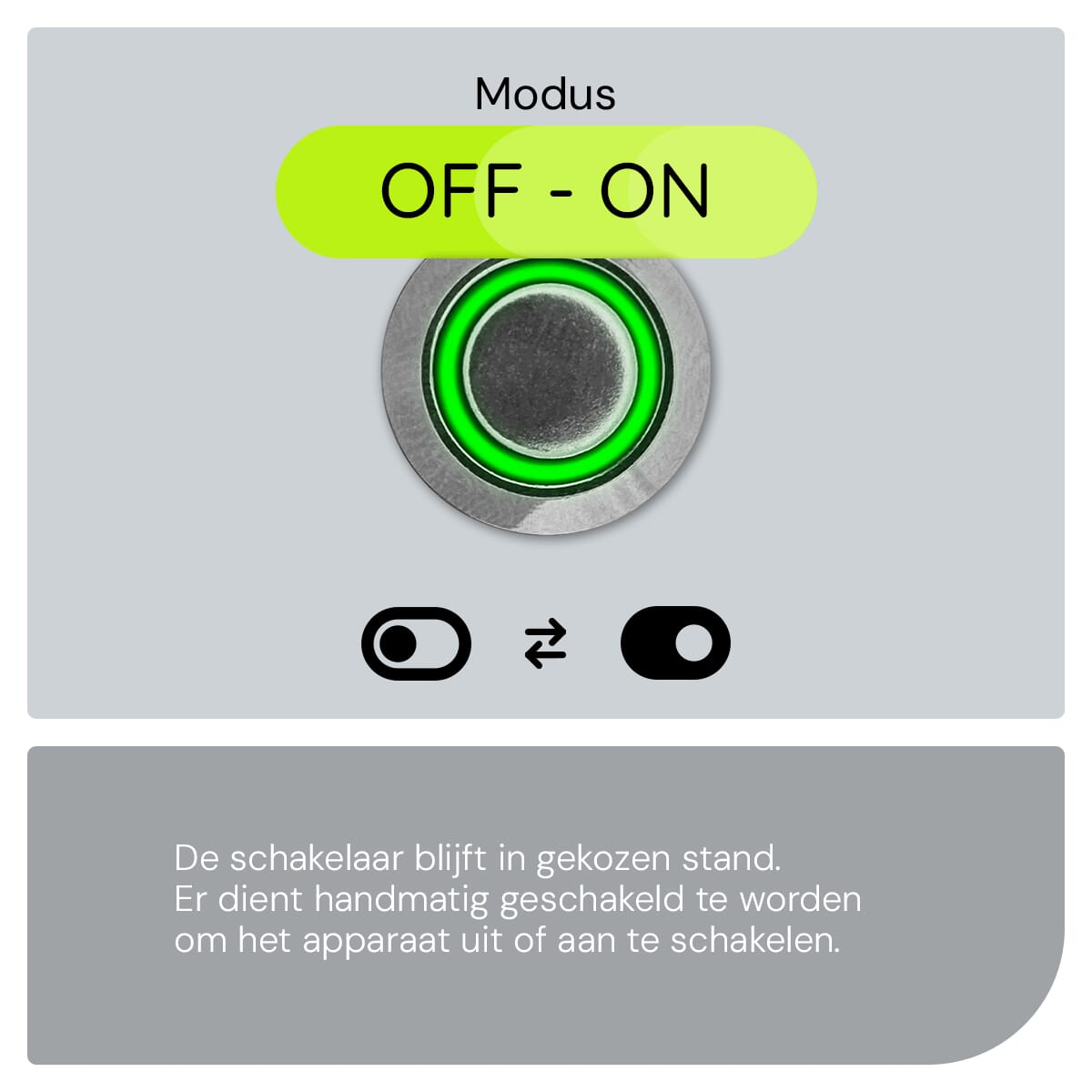 De ProRide Metalen Drukschakelaar werkt eenvoudig en efficiënt. Sluit de schakelaar aan op een 220V stroombron met de meegeleverde aansluitkabel. Druk op de knop om de stroom in- of uit te schakelen. De groene LED-indicatie licht op wanneer de schakelaar in de ‘aan’ positie staat, zodat je altijd weet wanneer het apparaat actief is.