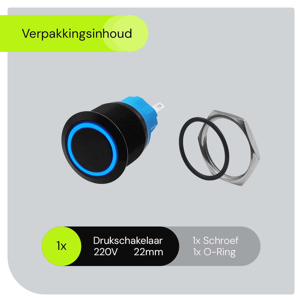 ProRide Metalen Drukschakelaar 220V ON-OFF – 22mm – Aan/uit schakelaar – Spatwaterdicht – LED Indicatie Blauw