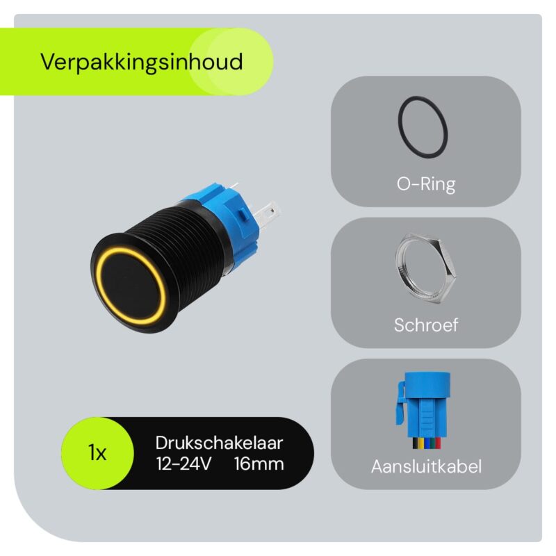 ProRide Metalen Pulsschakelaar 12V OFF-(ON) – 16mm – Momentschakelaar met Aansluitkabel – Spatwaterdicht – 12V/24V – LED Indicatie Geel