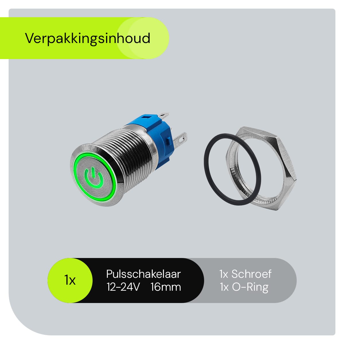 ProRide Metalen Pulsschakelaar 12V OFF-(ON) – 16mm – Momentschakelaar – Spatwaterdicht – 12V/24V – LED Indicatie Groen