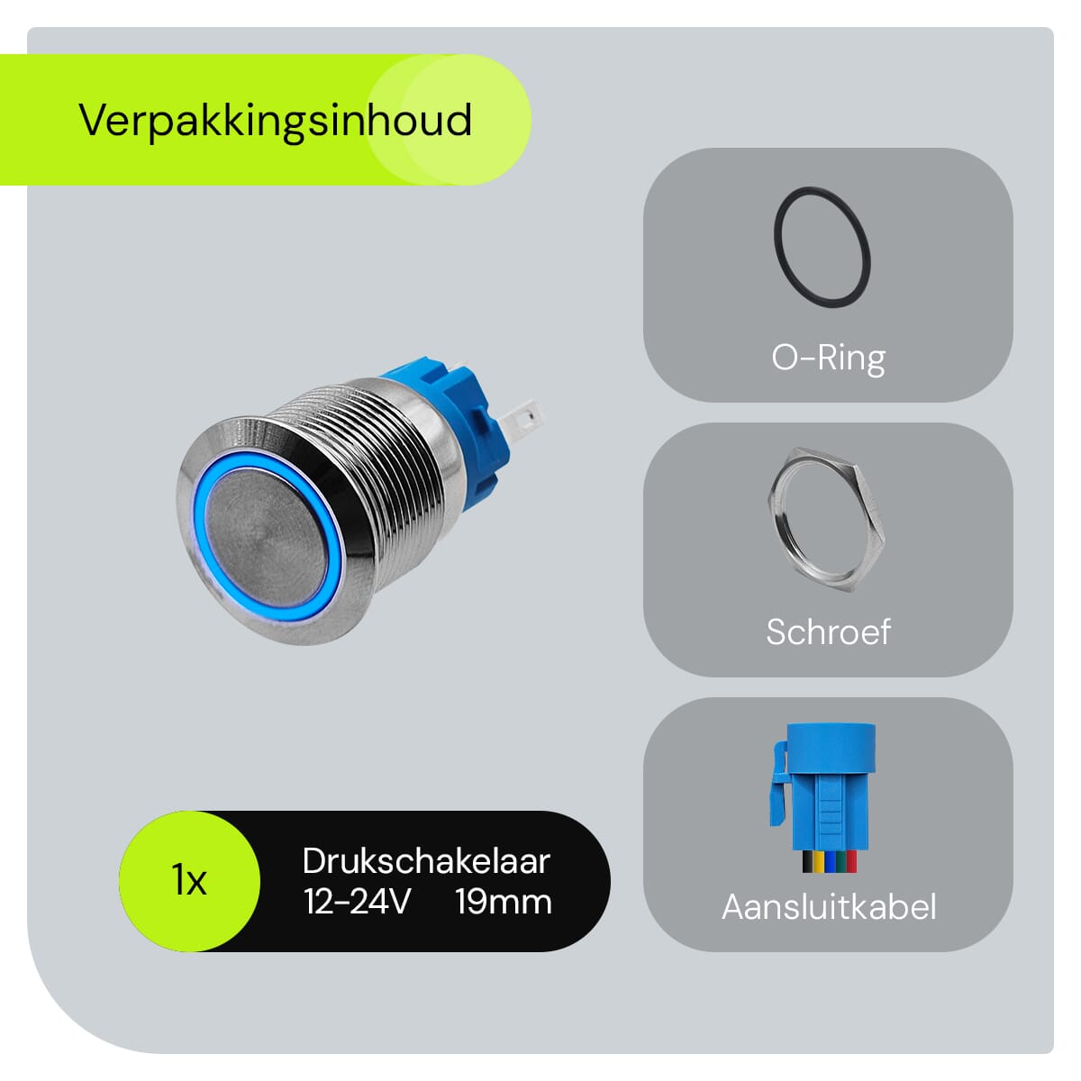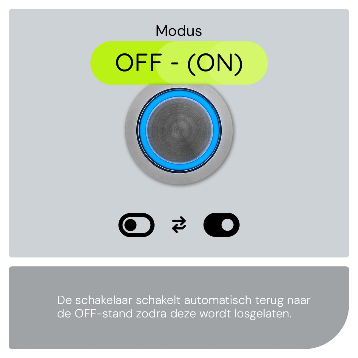 ProRide Metalen Pulsschakelaar 12V OFF-(ON) – 19mm – Momentschakelaar met Aansluitkabel – Spatwaterdicht – 12V/24V – LED Indicatie Blauw