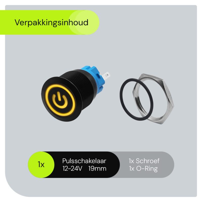 ProRide Metalen Pulsschakelaar 12V OFF-(ON) – 19mm – Momentschakelaar – Spatwaterdicht – 12V/24V – LED Indicatie Geel