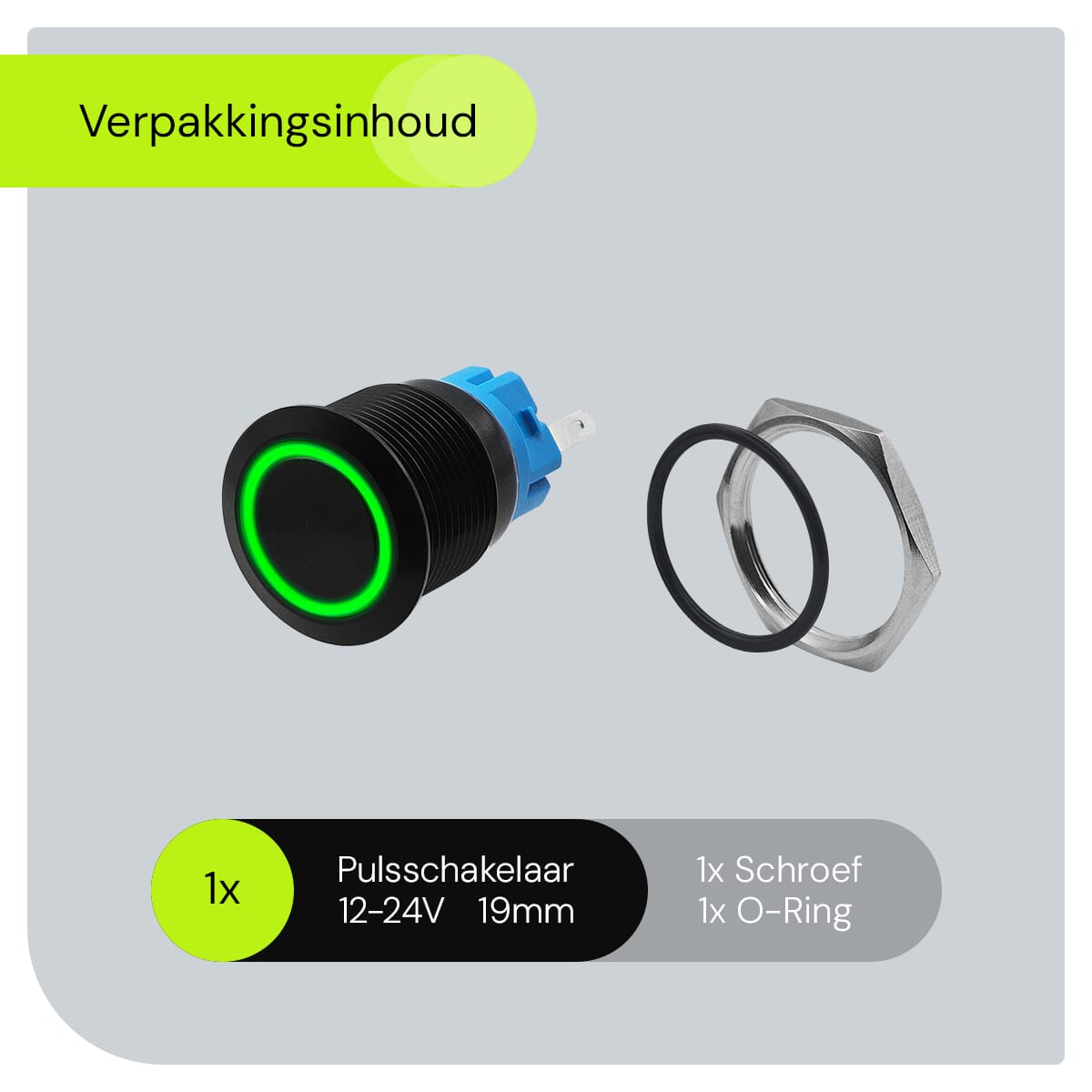 ProRide Metalen Pulsschakelaar 12V OFF-(ON) – 19mm – Momentschakelaar met Aansluitkabel – Spatwaterdicht – 12V/24V – LED Indicatie Groen