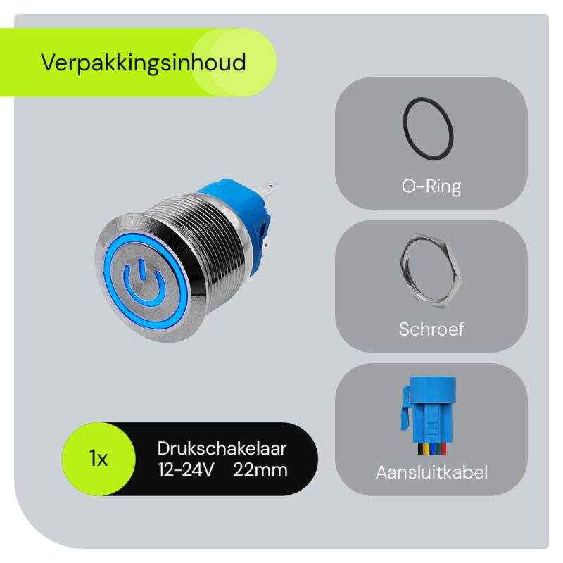 ProRide Metalen Pulsschakelaar 12V OFF-(ON) – 22mm – Momentschakelaar met Aansluitkabel – Spatwaterdicht – 12V/24V – LED Indicatie Blauw
