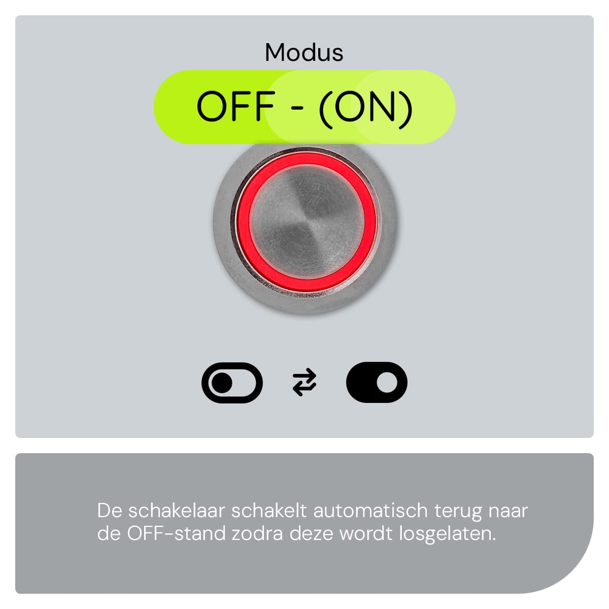 De ProRide Metalen Pulsschakelaar werkt als een momentschakelaar, wat betekent dat hij alleen actief is wanneer je hem indrukt. Zodra je de knop loslaat, keert hij terug naar de ‘OFF’ positie. Dit maakt hem ideaal voor toepassingen waar tijdelijke activering nodig is, zoals claxons of startknoppen.