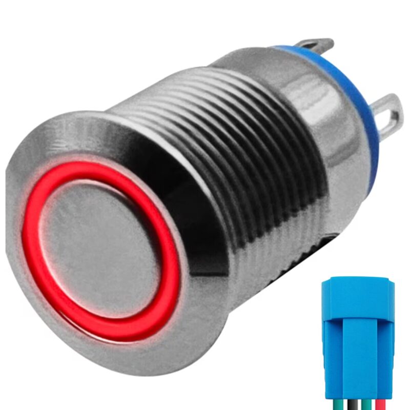 ProRide Metalen Pulsschakelaar 220V OFF-(ON) – 12mm – Momentschakelaar met Aansluitkabel – Spatwaterdicht – LED Indicatie Rood