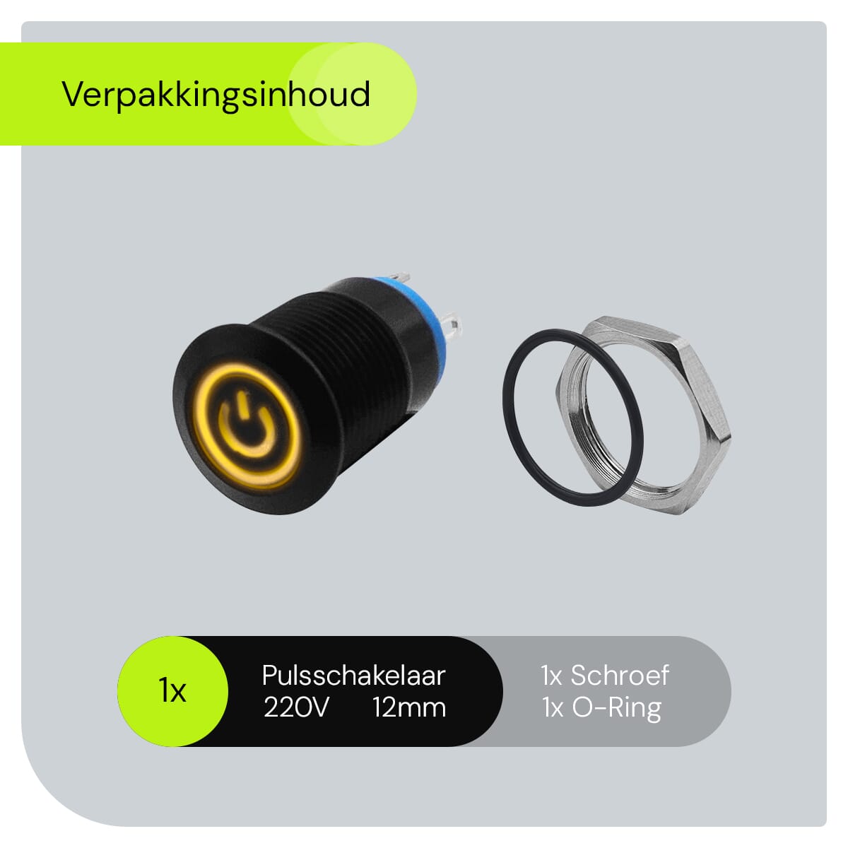 ProRide Metalen Pulsschakelaar 220V OFF-(ON) – 12mm – Momentschakelaar – Spatwaterdicht – LED Indicatie Geel