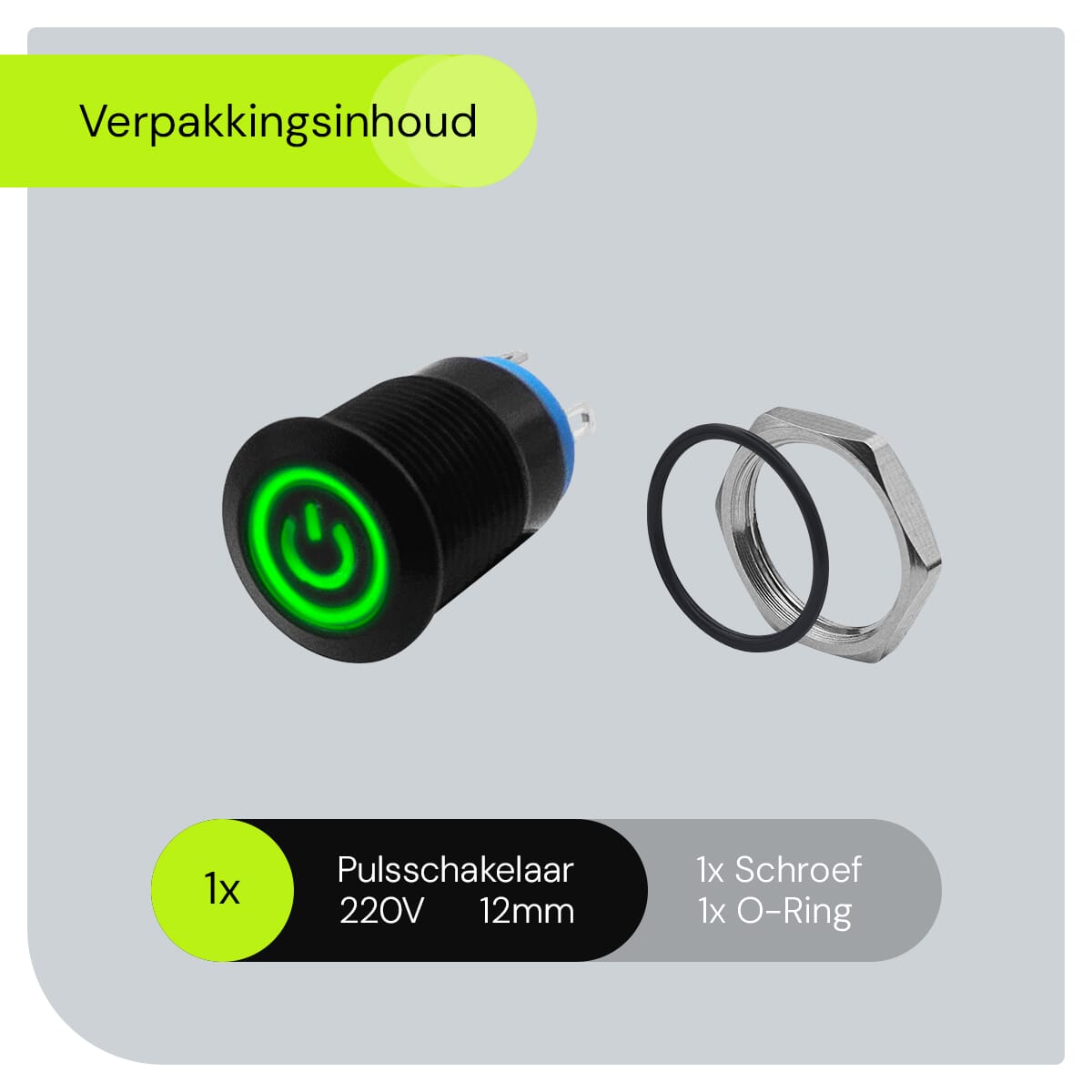 ProRide Metalen Pulsschakelaar 220V OFF-(ON) – 12mm – Momentschakelaar – Spatwaterdicht – LED Indicatie Groen