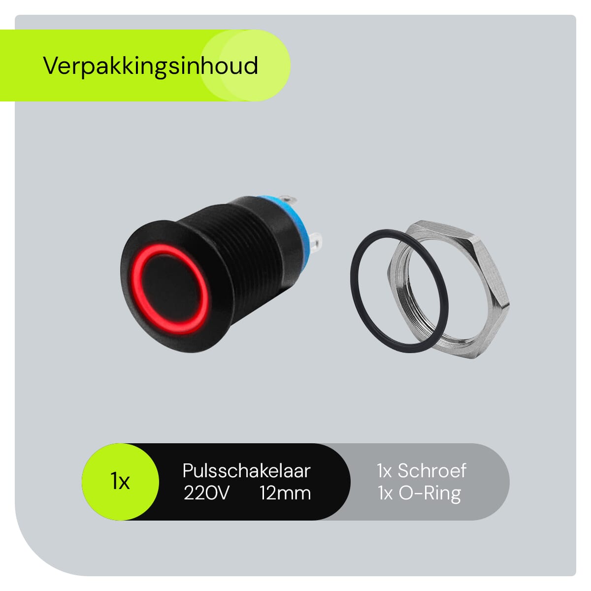 ProRide Metalen Pulsschakelaar 220V OFF-(ON) – 12mm – Momentschakelaar met Aansluitkabel – Spatwaterdicht – LED Indicatie Rood