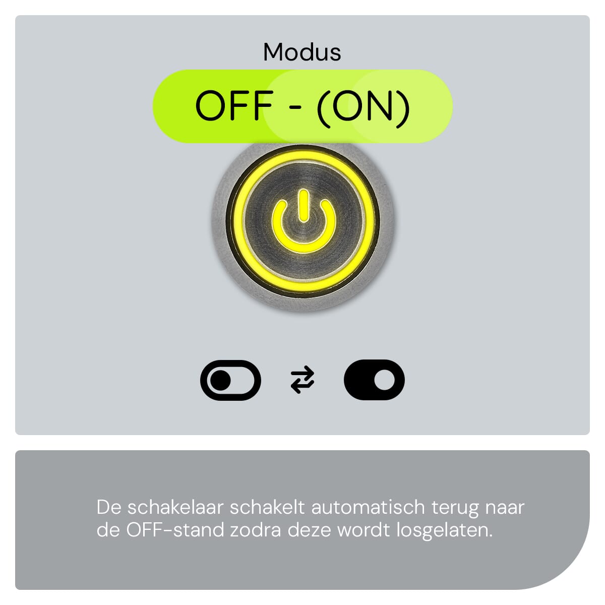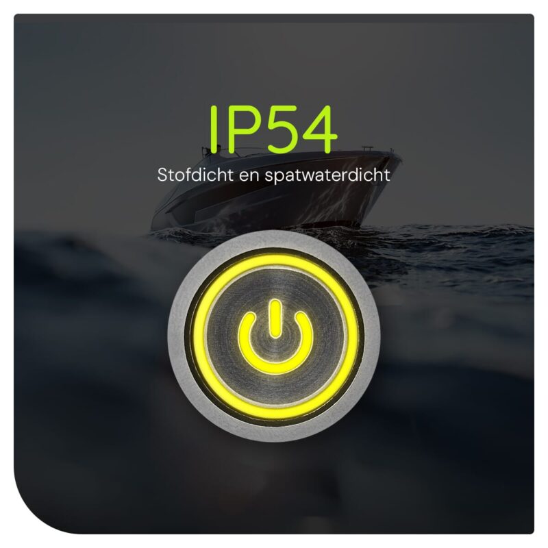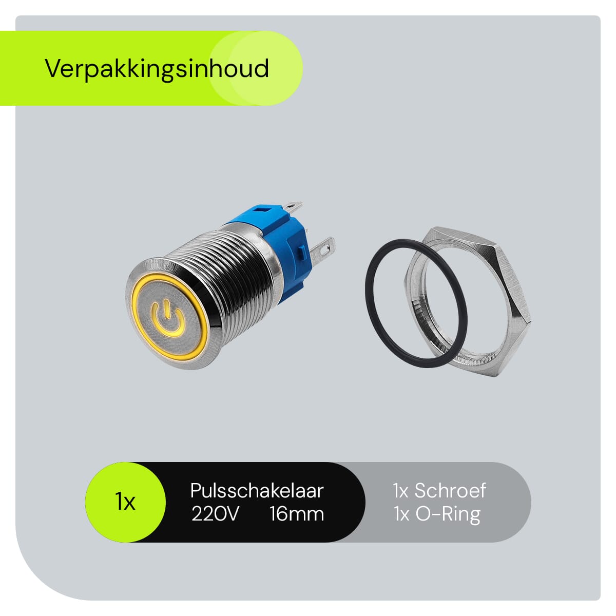 ProRide Metalen Pulsschakelaar 220V OFF-(ON) – 16mm – Momentschakelaar – Spatwaterdicht – LED Indicatie Geel