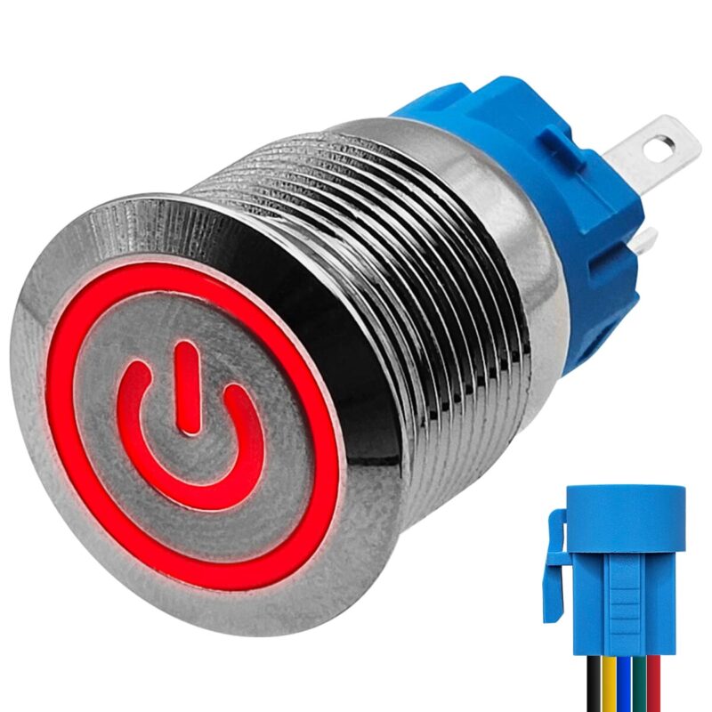 ProRide Metalen Pulsschakelaar 220V OFF-(ON) – 19mm – Momentschakelaar met Aansluitkabel – Spatwaterdicht – LED Indicatie Rood