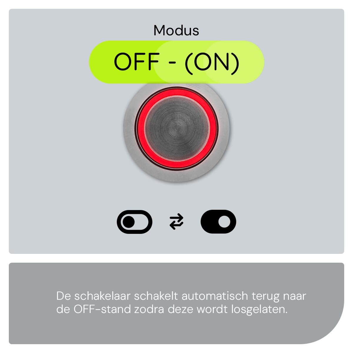 De ProRide Metalen Pulsschakelaar werkt op een eenvoudige OFF-(ON) basis. Dit betekent dat de schakelaar normaal gesproken in de ‘uit’ positie staat en alleen ‘aan’ gaat wanneer je erop drukt. De rode LED indicatie licht op wanneer de schakelaar wordt ingedrukt, zodat je direct visuele feedback krijgt.