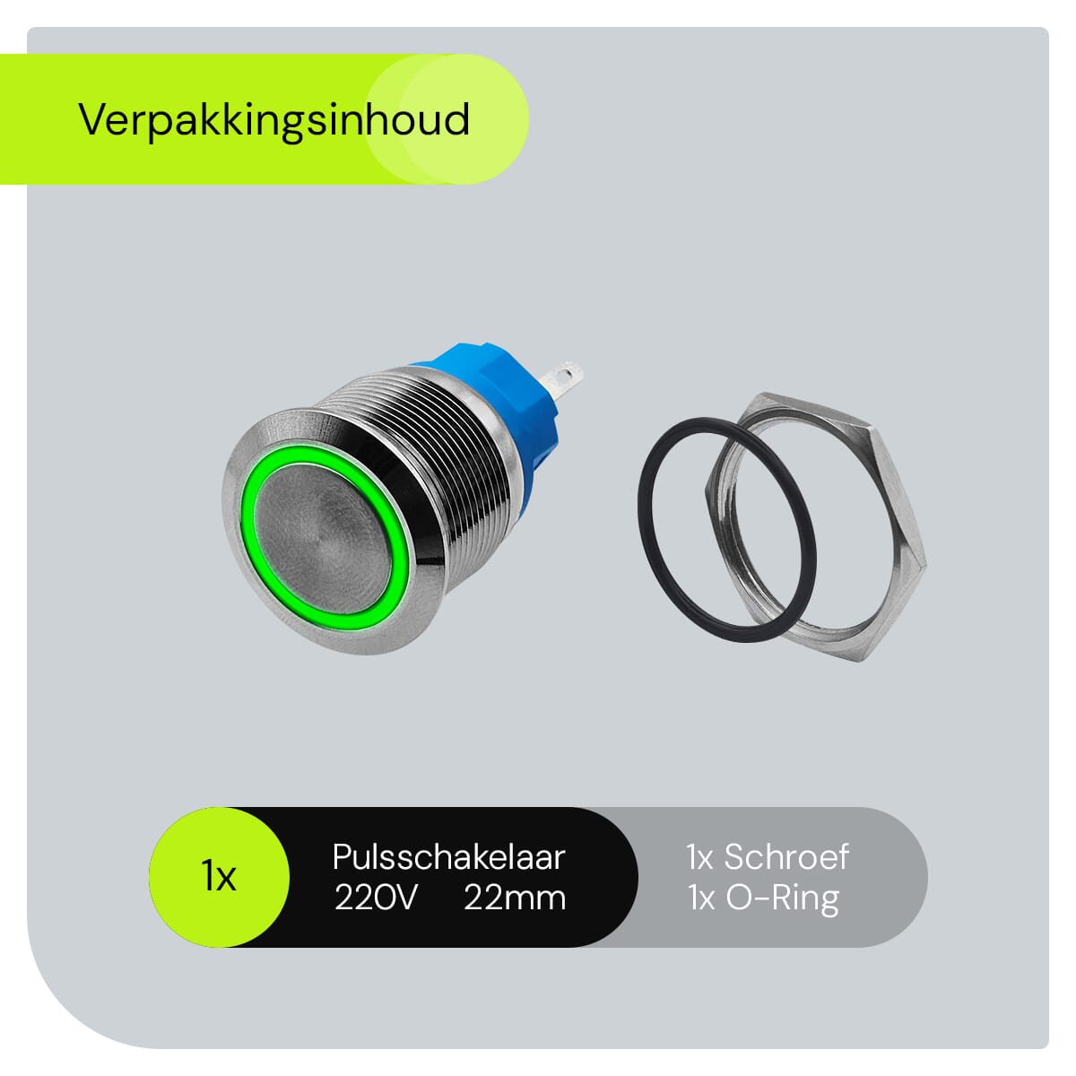 ProRide Metalen Pulsschakelaar 220V OFF-(ON) – 22mm – Momentschakelaar met Aansluitkabel – Spatwaterdicht – LED Indicatie Groen