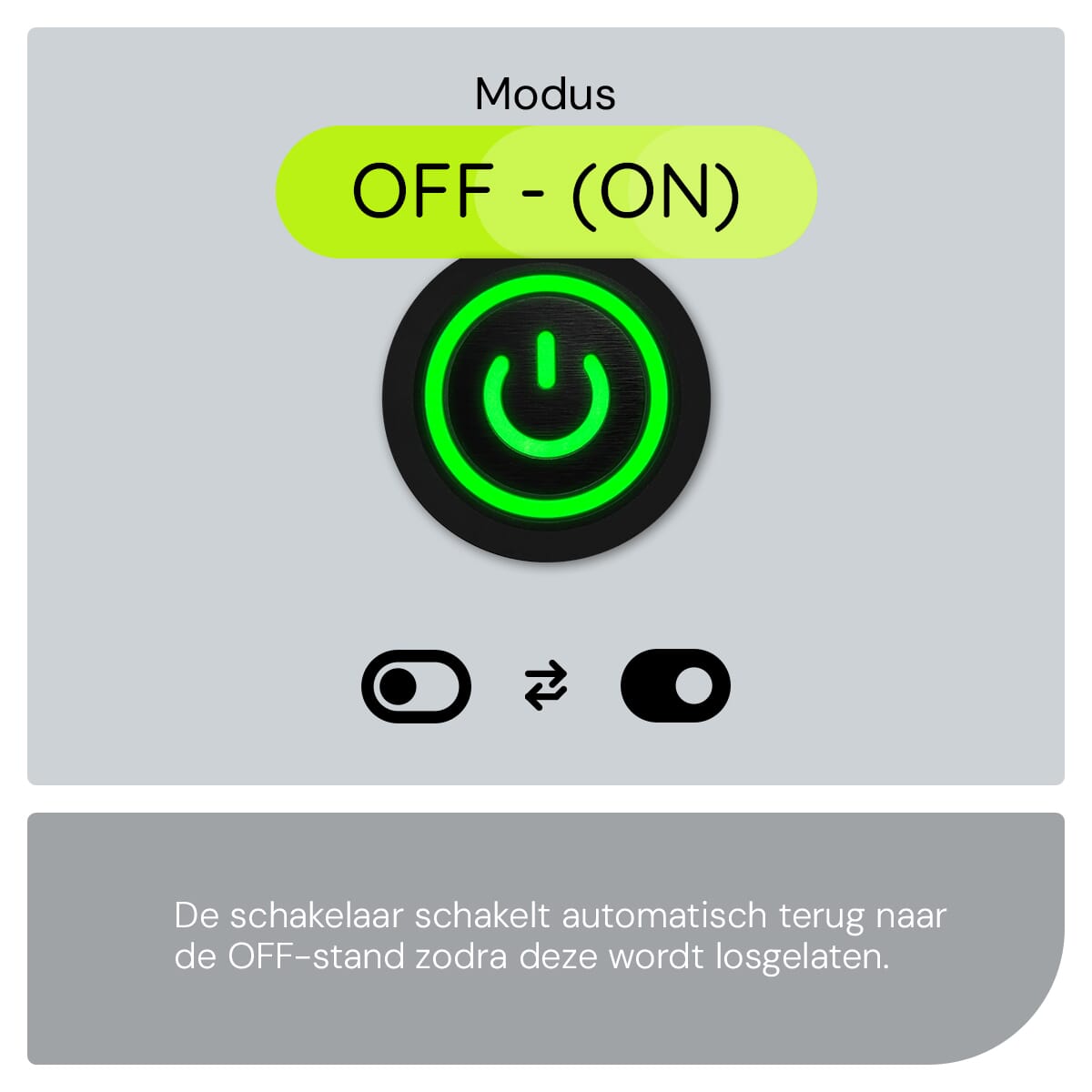 Dit betekent dat de schakelaar normaal gesproken in de ‘OFF’ positie staat en alleen naar ‘ON’ gaat wanneer je hem indrukt.