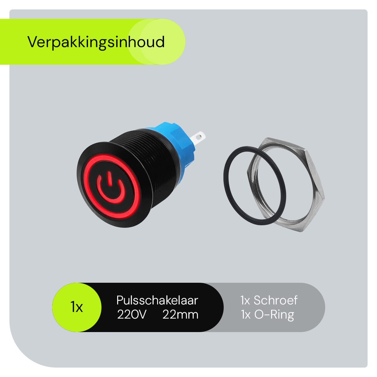 ProRide Metalen Pulsschakelaar 220V OFF-(ON) – 22mm – Momentschakelaar – Spatwaterdicht – LED Indicatie Rood