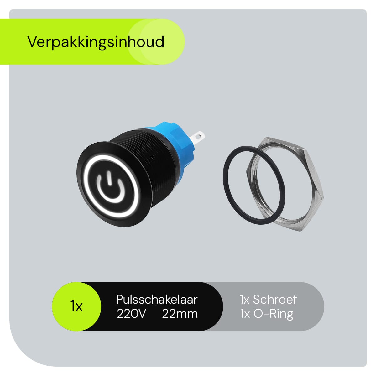 ProRide Metalen Pulsschakelaar 220V OFF-(ON) – 22mm – Momentschakelaar – Spatwaterdicht – LED Indicatie Wit