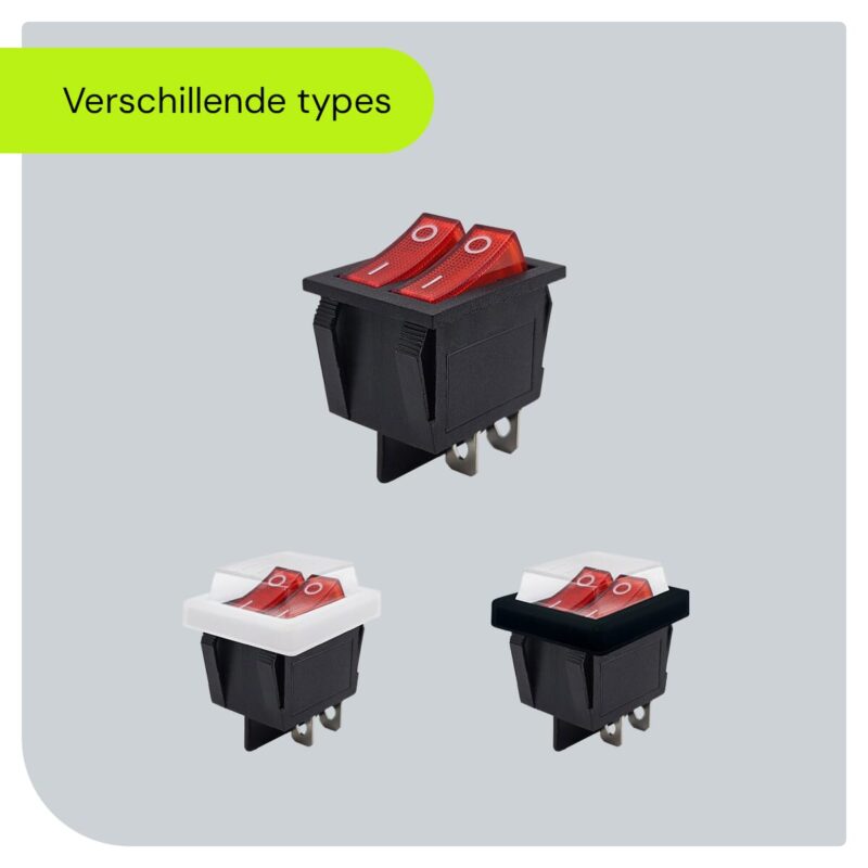 - Opties:Deze schakelaar is beschikbaar in het rood, blauw, groen, oranje en zwart. Met of zonder beschermkap en aansluitkabel.