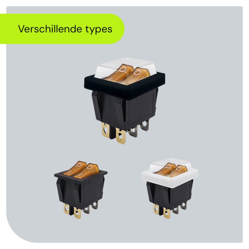 - Opties:Deze schakelaar is beschikbaar in het rood, blauw, groen, oranje en zwart. Met of zonder beschermkap en aansluitkabel.
