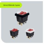 - Opties:Deze schakelaar is beschikbaar in het rood, blauw, groen, oranje en zwart. Met of zonder beschermkap en aansluitkabel.