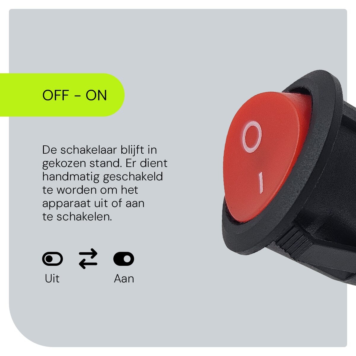 - ON – ON: Perfect als je controle wilt houden; de schakelaar blijft zoals je hem instelt.