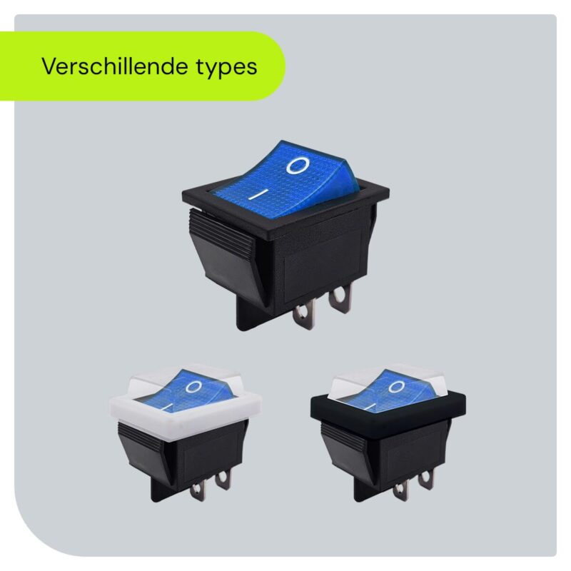 - Opties:Deze schakelaar is beschikbaar in het rood, blauw, groen, oranje en zwart. Met of zonder beschermkap en aansluitkabel.