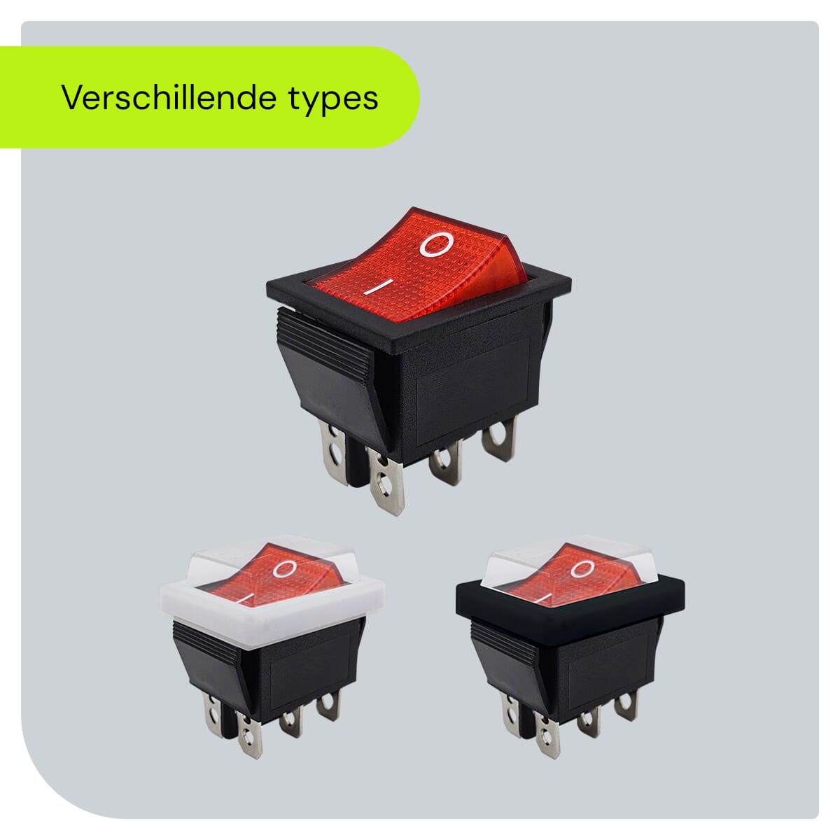 - Opties:Deze schakelaar is beschikbaar in het rood, blauw, groen, oranje en zwart. Met of zonder beschermkap en aansluitkabel.