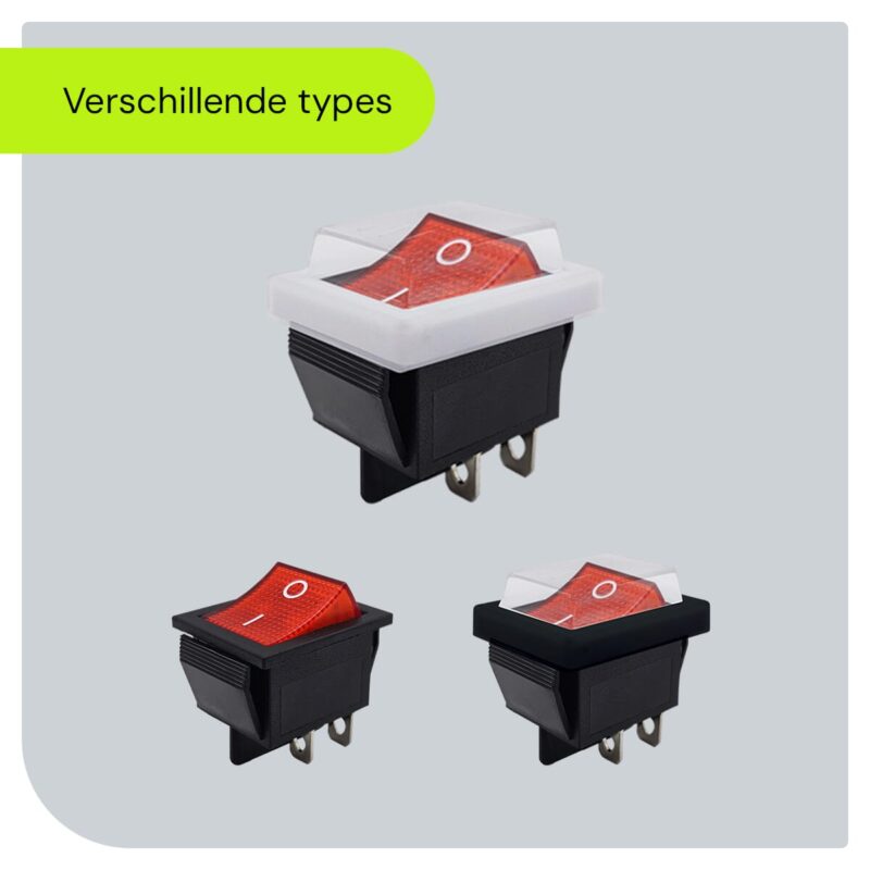 - Opties:Deze schakelaar is beschikbaar in het rood, blauw, groen, oranje en zwart. Met of zonder beschermkap en aansluitkabel.