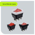- Opties:Deze schakelaar is beschikbaar in het rood, blauw, groen, oranje en zwart. Met of zonder beschermkap en aansluitkabel.